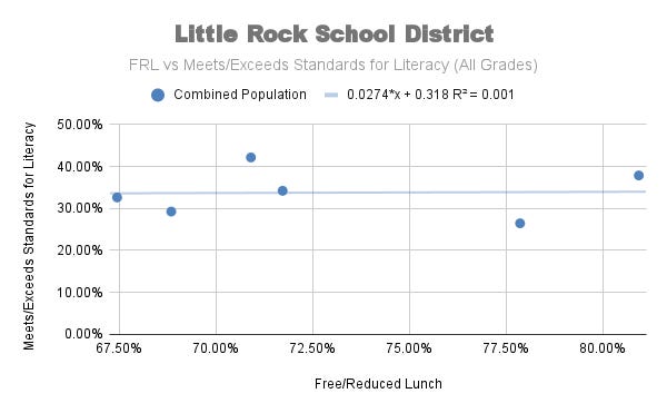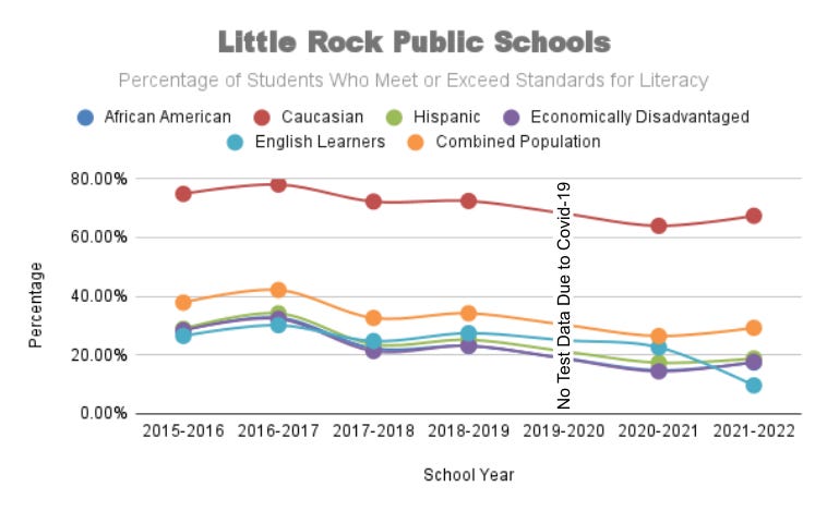 The Arkansas Department of Education’s Data Center has all sorts of educational data available to the public. I used it to generate a custom report so I could examine the data. Since literacy data is primarily what the state uses to determine a school’s letter grade, I decided to also use the literacy scores at LRSD going back to 2015. I looked at the combined percentage of students from all grade levels who meet or exceed standards for literacy. I have shared the graph I generated from the data. I chose to break it down by different student populations too.