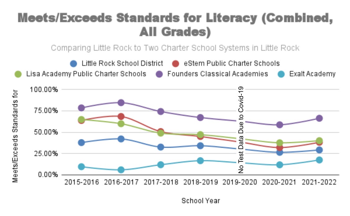 There are a few things I noticed about the data once I generated the graph. First, notice the general downward trend across all student populations. This trend existed before any learning loss due to Covid-19, but that certainly did not improve things. Second, the performance gap between Caucasian and other ethnic groups is quite stark. Caucasian students meet or exceed standards in literacy at a rate by 40-50%. Third, the groups all tend to change in lock-step with one another, with the exception of English learners during the last year I have data. Recall that the state took over LRSD in 2015 and control was returned in 2021. The takeover of LRSD coincided with charter schools expanding drastically in Little Rock.