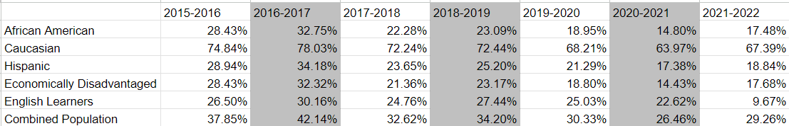 Update: I have been asked where the graph is for the African American students. It is virtually identical to the Economically Disadvantaged and indistinguishable in this view. Here is the data used to make this graph.