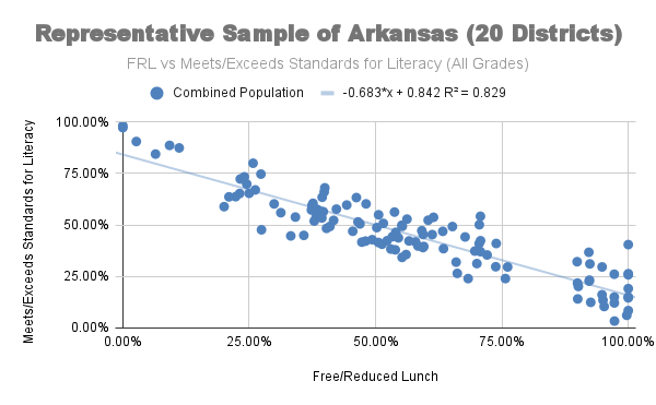 However, I wanted to see if my hypothesis held true outside of Little Rock. Remember, not all the data indicated a strong negative relationship existed between FRL and meet/exceed rates for standardized test scores. Data from LRSD seemed to indicate there was no relationship, but was that actually the case? I would need more data if I were to find the answer to this question.