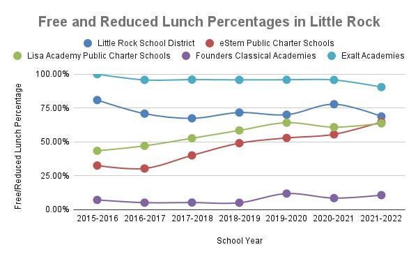 I proceeded to check the enrollment numbers for the largest charter school systems in Little Rock, namely eStem Public Charter Schools, Lisa Academy, Founders Classical Academy - West Little Rock, and Exalt Academy of Southwest Little Rock. You can click on each graph below to see the full-sized version of each. All of them saw an increase in enrollment. So far my hypothesis seems to be on the right track.
